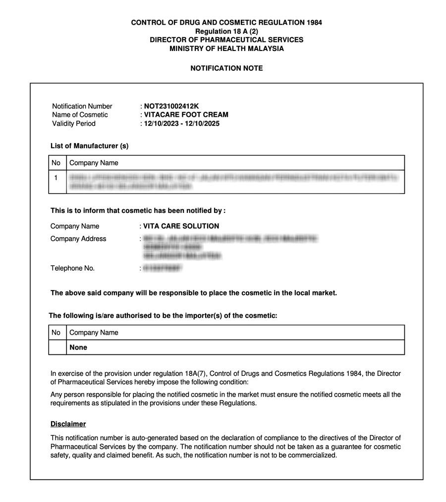 Vitacare telah mendapat kelulusan dari KKM & Pensijilan dari Independent Lab bebas dari heavy metal, steroid, dadah dan kimia merbahaya.